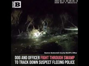 The Snohomish County Sheriff’s Office released footage showing an officer and his dog tracking a suspect through a swamp who had fled police after crashing